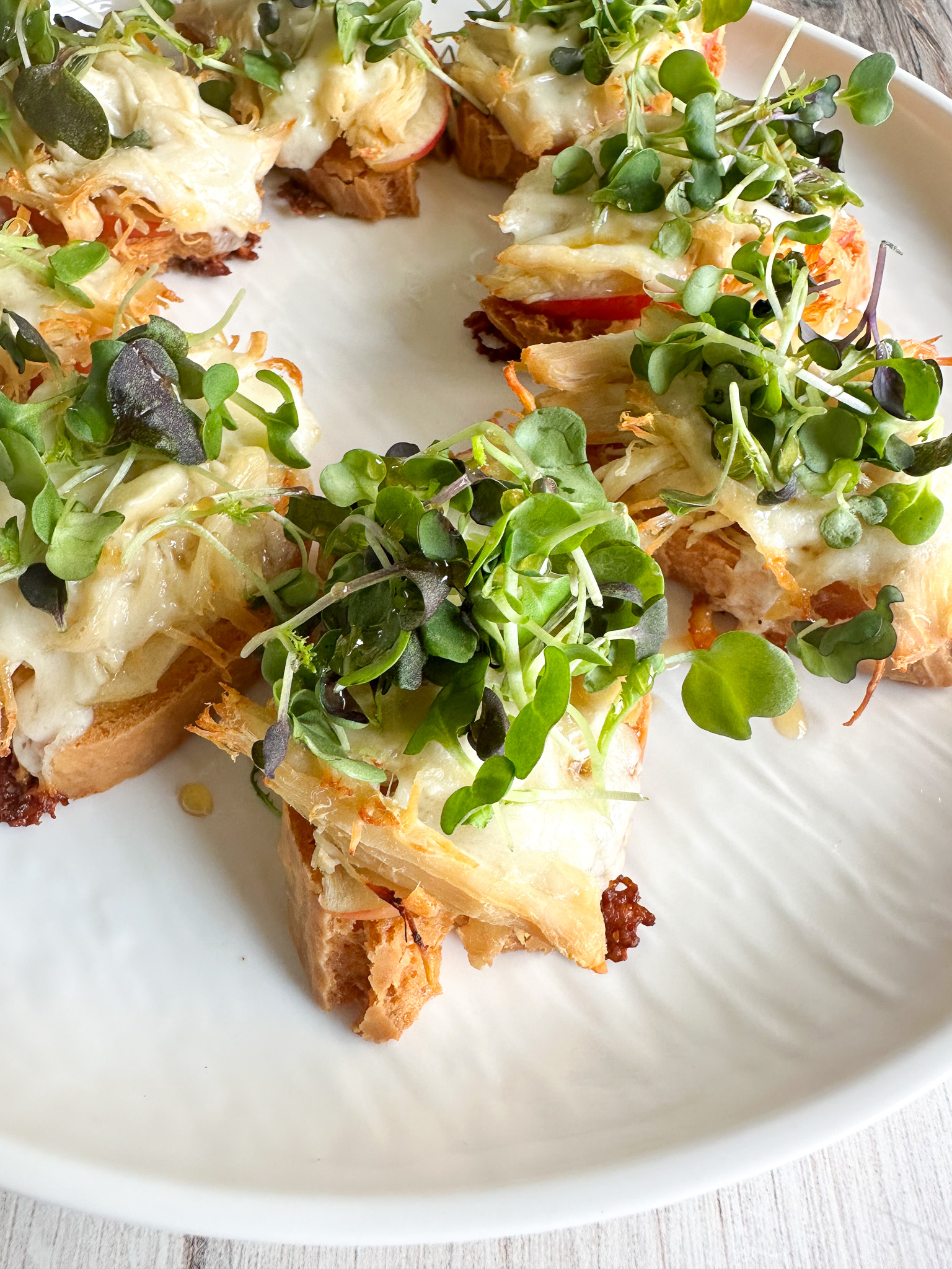 These Chicken, Brie, and Apple Crostini are a perfect blend of savory, creamy, and subtly sweet flavors. Tender, simply prepared US Wellness Meats chicken breast is layered over crisp toasted crostini, topped with slices of brie that gently melt into the warm chicken. Fresh, crisp apple adds a bright, juicy crunch, while a handful of delicate microgreens brings freshness and a touch of earthiness. Finished with a light drizzle of honey, each bite is beautifully balanced—making these crostini an elegant appetizer for a Super Bowl party or a refined addition to a brunch or wine night spread.